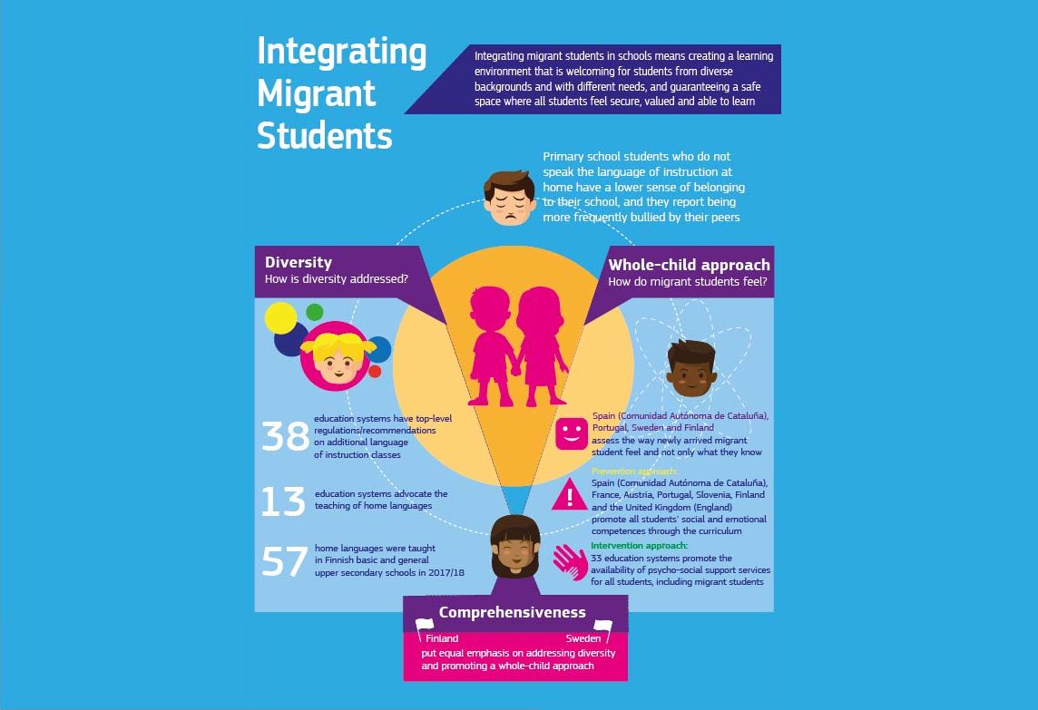 The report highlights that even though, in the majority of education systems in Europe, access to education is provided for children with migrant backgrounds and intercultural education is integrated to some extend in the national curricula, policies and measures on learning support tend to focus on students’ academic rather than their social and emotional needs (‘whole-child approach’). Moreover, according to the report, an initial and continued assessment of migrant students’ educational progress is not widely carried out and mainly focuses on the language of instruction. Other challenges emphasised in the study include unpreparedness of teachers to work in culturally diverse classrooms due to the lack of teacher training on these topics, migrant students whose home language differs from the language of instruction not having a right to study their home language at school, and lack of support provided for teachers and school heads (for example, providing teaching assistants and intercultural mediators). Among countries having good strategies for integrating migrant students in education, the report names Germany and Austria for a strong emphasis on diversity, Spain (Comunidad Autonoma de Cataluña), Portugal and Slovenia for a successful approach to the whole-child approach, and Finland and Sweden for keeping both the diversity dimension and the whole-child approach.