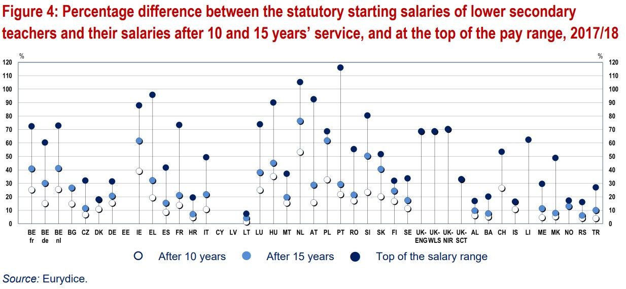 Потенциал роста заработной платы учителей в течение всей их профессиональной деятельности также значительно варьирует. В таких странах как Греция, Франция, Люксембург, Венгрия, Австрия и Франция, заработная плата учителей с наибольшим стажем работы оказывается на 70% выше исходной зарплаты. Например, первая зарплата учителя в Австрии начинается с 35 205 Евро, в то время как у самых оплачиваемых опытных коллег она составляет 72 763 Евро. Однако для достижения таких более высоких окладов требуется от 29 до 42 лет стажа.
