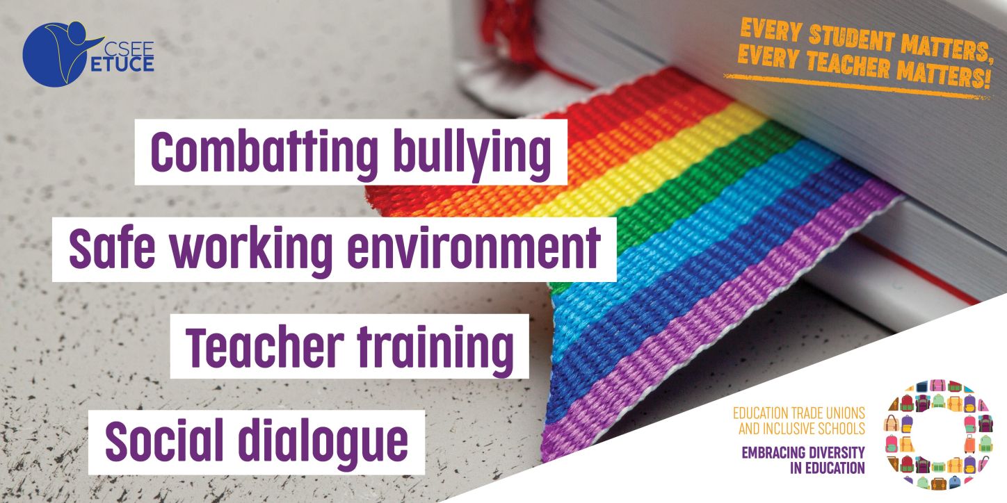 On 17 May 2021, ETUCE celebrates the International Day Against Homophobia, Transphobia and Biphobia (IDAHOBIT) by following the international theme “ Together: Resisting, Supporting, Healing!” and calling on all stakeholders in education to unite their efforts for LGBTI inclusive education and society. Under the slogan ‘Together for LGBTI Inclusive Education!’, education trade unions reconfirm their commitment to promoting the positive inclusion of LGBTI students and education personnel in education institutions and in society, and demand to provide sufficient support to education personnel in addressing homophobia, transphobia and biphobia. Trade unions’ national activities, together with testimonies from teachers implementing and promoting the LGBTI inclusive education, are shared on the ETUCE website and social media in the framework of the project ‘ Trade Unions and Inclusive Schools: Embracing Diversity in Education’.