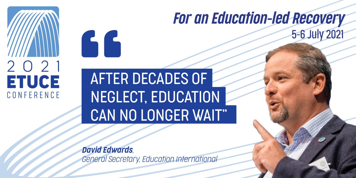 David Edwards, General Secretary of EI, to address the audience provided examples of the impact of the crisis on human rights and democracy in the world and underlined the importance of education trade unions for a sustainable and democratic recovery. “ After decades of neglect, education can no longer wait. There is an urgent need to mobilise. There is not a day that goes by when I am not impressed and humbled by the commitment of teachers and trade unions. We are powerful. We are resilient. Solidarity is our challenge and our mission.”