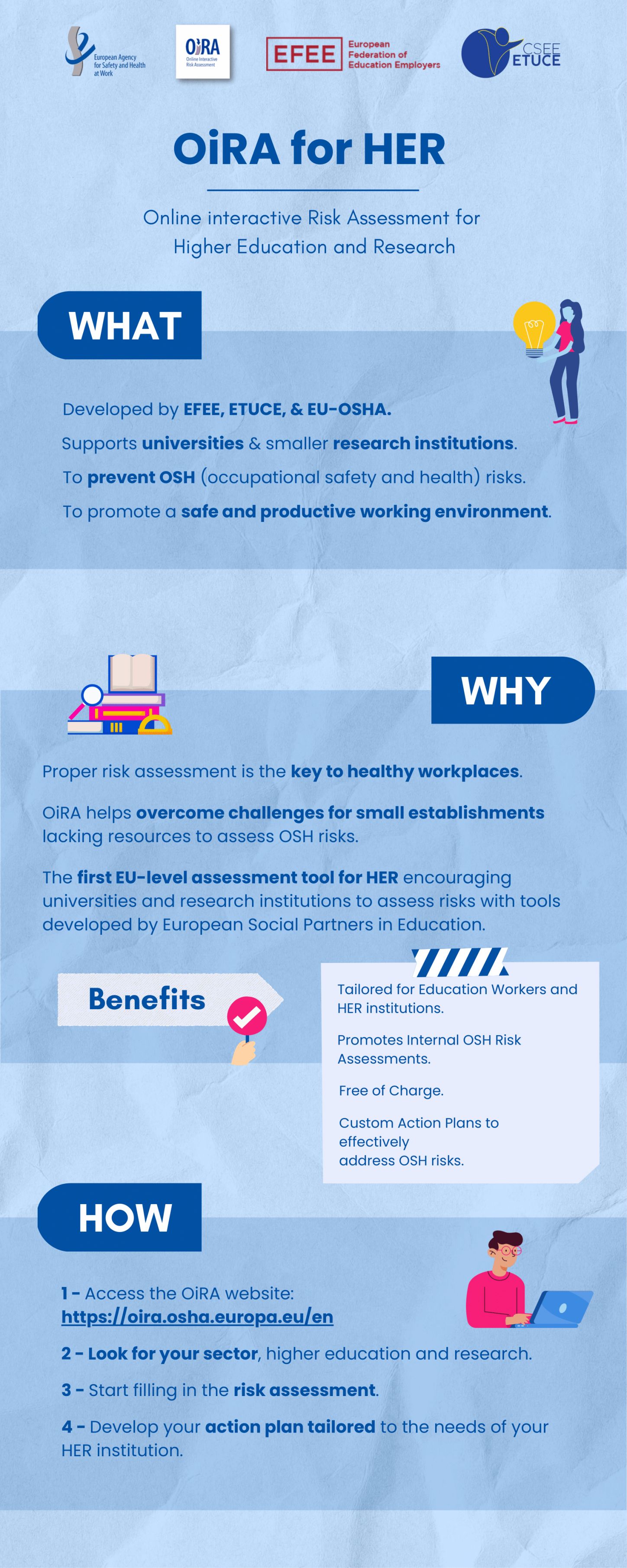This event will introduce the new Online Interactive Risk Assessment (OiRA) tool for Higher Education and Research (HER), developed by ETUCE and EFEE, the European social partners in Education, in collaboration with the EU Agency for Safety and Health at Work (EU-OSHA).