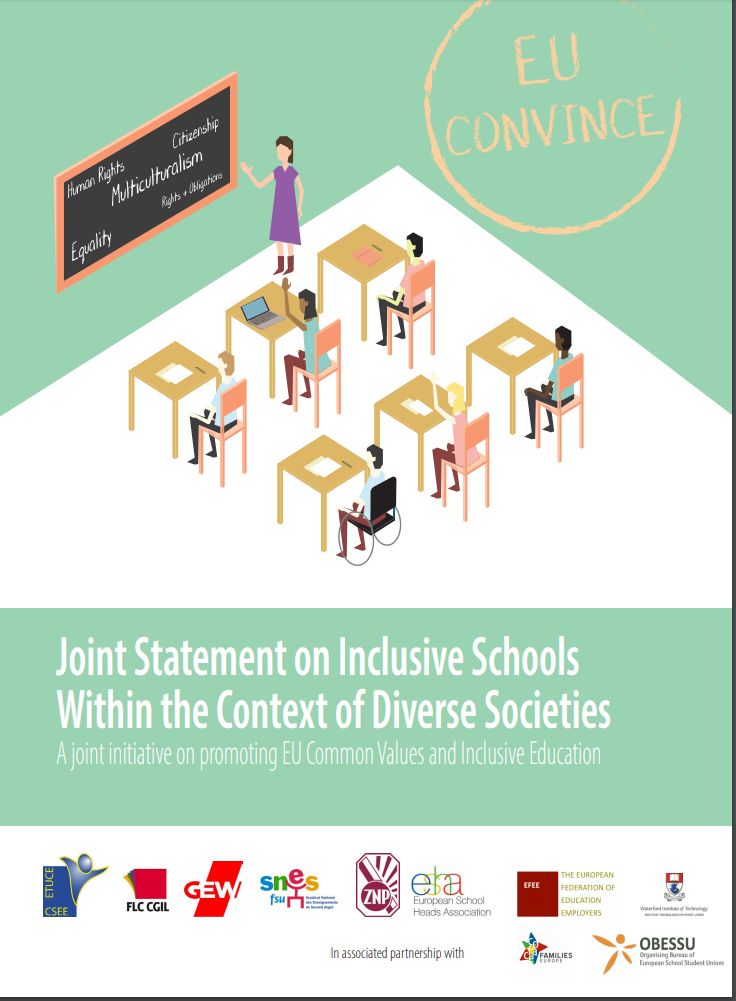 The Joint Statement on Inclusive Schools Within the Context of Diverse Societies, is written by ETUCE in partnership with EFEE (European Federation of Education Employers) and ESHA (European School Heads Association). The statement underlines that a carefully built inclusive learning environment is the basis of education which meets the needs and interests of all learners and education personnel regardless of their background. Therefore, the Statement outlines the five key elements of the inclusive schools within the context of diverse societies: