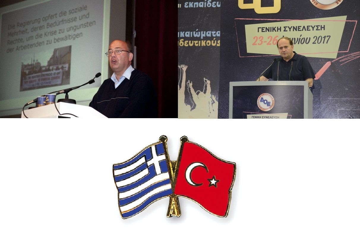Kikinis Thanasis, Président de DOE, a déclaré : « La solidarité des syndicats grecs envers nos collègues de Turquie existe depuis longtemps. Au cours des derniers mois, parmi nos collègues turcs/turques et leurs familles qui ont réussi à s'échapper de Turquie vers d'autres pays européens, nombreux sont ceux et celles qui ont transité par la Grèce. Nous avons coopéré avec l’ADEDY (la confédération des fonctionnaires de Grèce) afin de nommer des avocats pour les épauler dans toutes les procédures nécessaires à leur réaffectation dans d'autres pays européens. Le soutien de DOE est principalement axé sur la couverture des besoins immédiats des affilié(e)s d'Eğitim Sen. Ces besoins que nous essayons de couvrir concernent notamment l'accueil, l'appui financier, et l’aide dans les procédures nécessaires à leur réaffectation dans le pays de l'UE de leur choix».