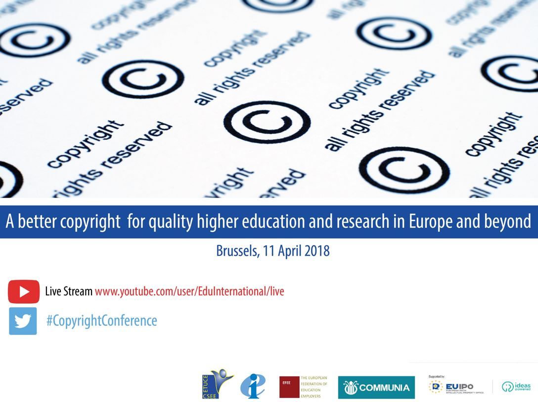 11 апреля 2018 года ETUCE провела совместную конференцию высокого уровня, озаглавленную «Совершенствование концепции авторского права для обеспечения качественного высшего образования и науки в Европе и за ее пределами». Конференция EI/ETUCE была организована в партнерстве с Европейской федерацией работодателей в сфере образования (EFEE) и COMMUNIA (сеть юристов и адвокатов, специализирующихся на интеллектуальной собственности). Финансовую поддержку этому мероприятию оказало Бюро Европейского союза по интеллектуальной собственности (EUIPO)