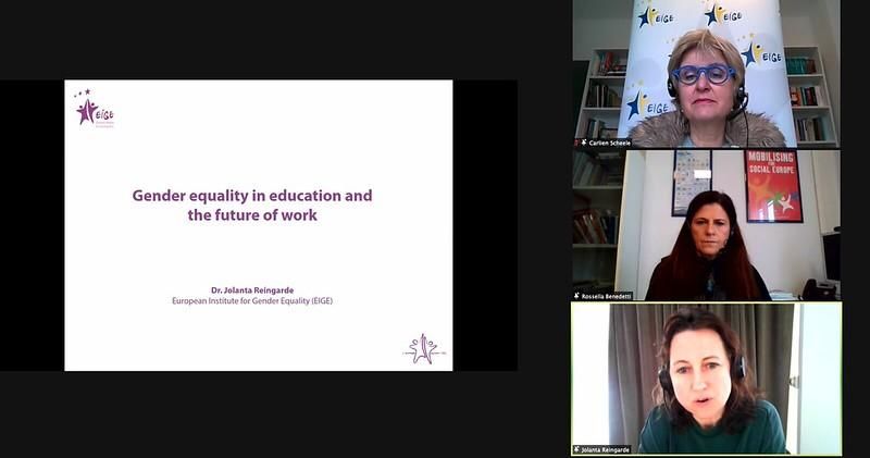 Dans la continuité des activités et initiatives récentes du CSEE concernant l'égalité des chances au niveau de l'UE, la réunion s'est concentrée sur un débat thématique sur l'égalité des genres dans l'éducation et l'avenir du travail. La Directrice de l'Institut européen de l'égalité des hommes et des femmes (EIGE), Carlien Scheele, a présenté les derniers constats de l’EIGE sur les inégalités entre les genres dans l'éducation. Parmi les principaux problèmes de genre dans l'éducation, Jolanda Reingardė, Cheffe d'équipe de l'EIGE pour la recherche et les statistiques, a souligné l'écart de rémunération persistant entre les femmes et les hommes, un profond fossé (se creusant avec l'âge) entre les sexes dans le choix de l'éducation et au niveau des compétences numériques ainsi que l’impact de la pandémie de COVID-19 sur l'inégalité entre les genres en termes de taux de chômage, de conditions de travail précaires et de prestations de soins. En outre, l’EIGE publiera prochainement une nouvelle étude sur « L’égalité de genre et les conséquences socio-économiques de la crise du COVID-19». Les participant·e·s ont échangé leurs expériences nationales dans la mise en œuvre du Plan d’Action du CSEE pour l’égalité de genres. Concernant les bonnes pratiques, des organisations membres de France, de Géorgie, d'Allemagne, d'Irlande, d'Italie, des Pays-Bas et du Royaume-Uni ont partagé des exemples de dialogue avec le gouvernement, de campagnes, de création d'organismes de promotion de l'égalité, de rapports, de plans d'action et de fourniture d'une assistance juridique pour lutter contre les stéréotypes sexistes, la violence sexiste et la sous-représentation des femmes aux postes de direction.