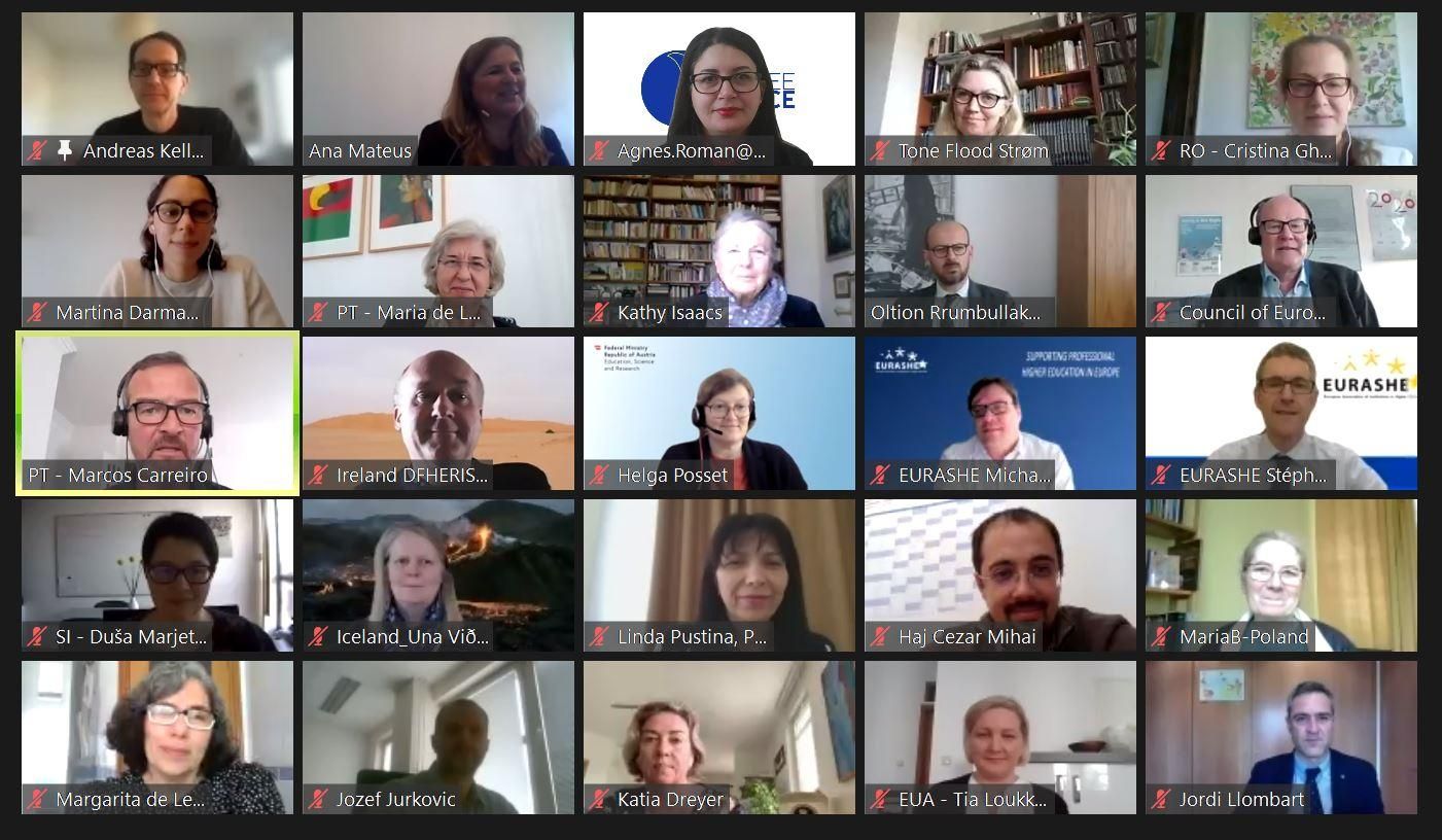 Suite à l'adoption du le Communiqué ministériel de Rome, la réunion plénière du Groupe de suivi de Bologne (BFUG), l'organe de suivi du processus de Bologne a eu lieu du 15 au 16 avril 2021, avec 103 participant·e·s dont des représentant·e·s des ministères de l'Education de 49 pays et de 10 membres consultatifs [1].
