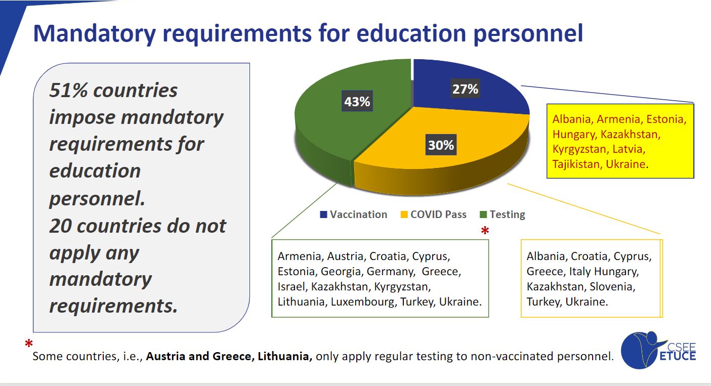 Les conclusions de l' étude du CSEE sur la vaccination obligatoire et l’état de l’éducation en Europe ont été présentées et discutées par les membres du Comité. L'étude du CSEE a révélé que 51 % des pays européens imposent des exigences obligatoires aux enseignant·e·s et au personnel éducatif pour effectuer leur travail. Alors que la vaccination obligatoire est déjà en place dans 9 pays et en discussion dans de nombreux autres, les syndicats sont sérieusement préoccupés par l'impact de ces mesures sur les droits du travail des enseignant·e·s et du personnel éducatif.