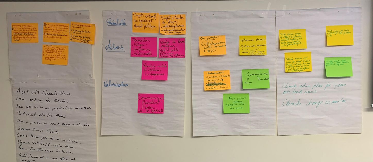 Les participant·e·s à la formation ont également eu l'occasion de présenter et d'échanger des exemples d'actions qui peuvent être intégrées dans l'agenda syndical pour répondre aux questions de la durabilité et de l'urgence climatique. Il est en effet crucial pour les syndicats de l'enseignement de relever les défis sociétaux afin de rester politiquement pertinents et de continuer à recruter et à attirer des membres. Trois séries d'actions syndicales ont été mises en évidence : premièrement, exiger que les programmes d'études à tous les niveaux d'enseignement abordent les problèmes liés au changement climatique et à l'environnement ; deuxièmement, développer davantage d'activités syndicales sur ces sujets ; et troisièmement, rendre les lieux de travail plus respectueux de l'environnement.