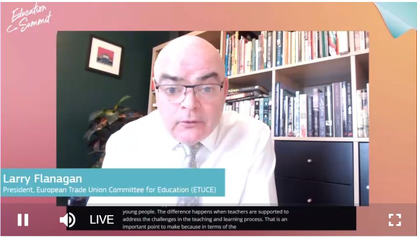 Les syndicats de l'enseignement, représentés par Larry Flanagan, Président du CSEE, ont participé au quatrième Sommet européen de l'éducation, qui a eu lieu le 9 décembre 2021. Les interventions étaient principalement axées sur l'importance de l'avenir de l'initiative universitaire européenne, ainsi que sur la durabilité, la numérisation et l'égalité dans l'éducation.